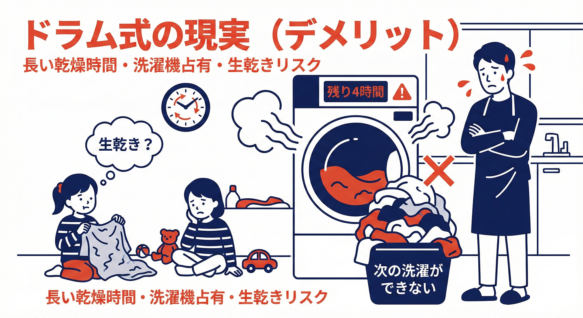 実は、ドラム式の最大のメリットである洗濯から乾燥までワンストップというのが「落とし穴」だった。